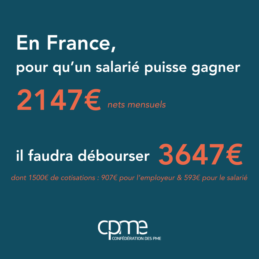 Aujourd’hui le résultat est là : en France, pour qu’un salarié puisse gagner 2147€ nets mensuels, il faudra débourser 3647 € (dont 1500€ de cotisations : 907 € pour l’employeur et 593€ pour le salarié).