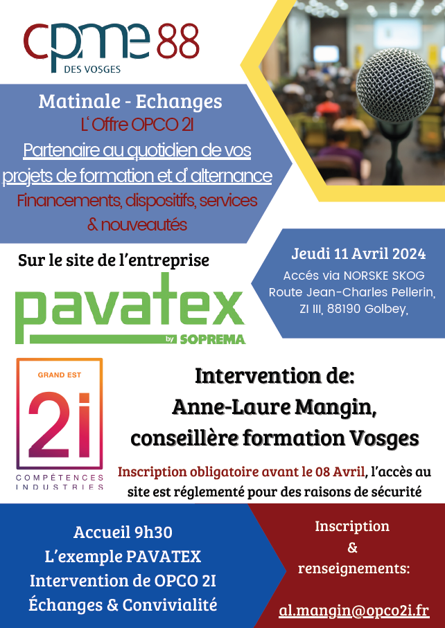 Jeudi 11 avril, notre commission formations, présidée par Elyse FERRY, proposera aux entreprises de la branche industrie de rencontrer leur OPCO, l’OPCO 2I. Pour cette évènement, nous serons accueilli par l’entreprise PAVATEX et recevrons les entreprises dès 9h. Anne-Laure MANGIN conseillère entreprise viendra leur présenter l’offre de services et les aides proposés par l’opérateur de compétence et répondre à toutes leurs questions. Il reste encore des places, si vous relevez de cet OPCO, pensez à vous inscrire.