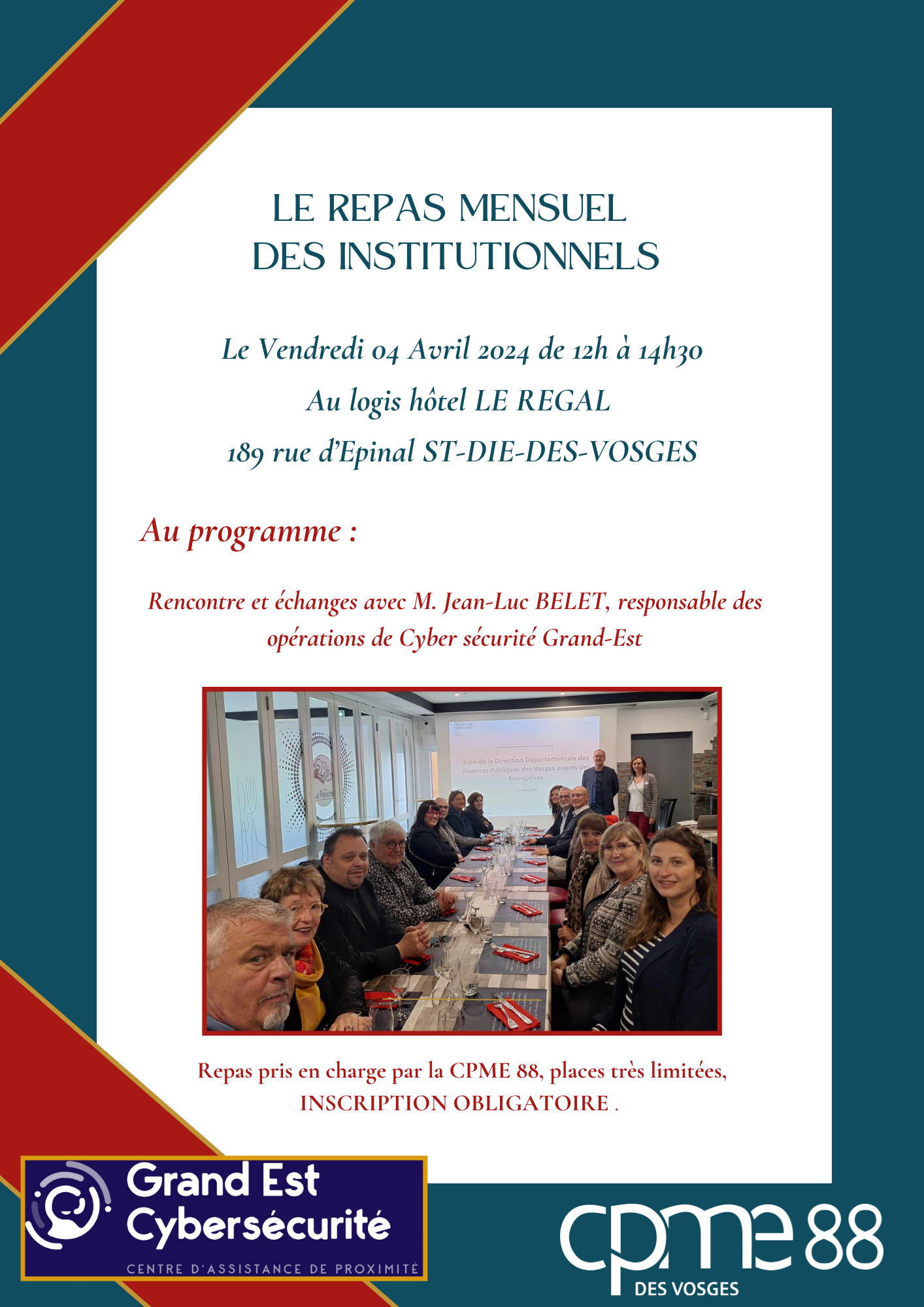 LE REPAS MENSUEL DES INSTITUTIONNELS « Cyber sécurité Grand-Est » Le Vendredi 04 Avril 2025 de 12h à 14h30 Restaurant Le Panache 72 rue Neuve Grange ST Laurent EPINALAu programme : Rencontre et échanges avec M. Jean-Luc BELET, responsable des opérations de Cyber sécurité Grand-Est + Ajouter à mon Agenda Google + iCal / Outlook export Date 04 Avr 2025 Expiré! Heure 11:45 - 14:00 Partagez cet événement