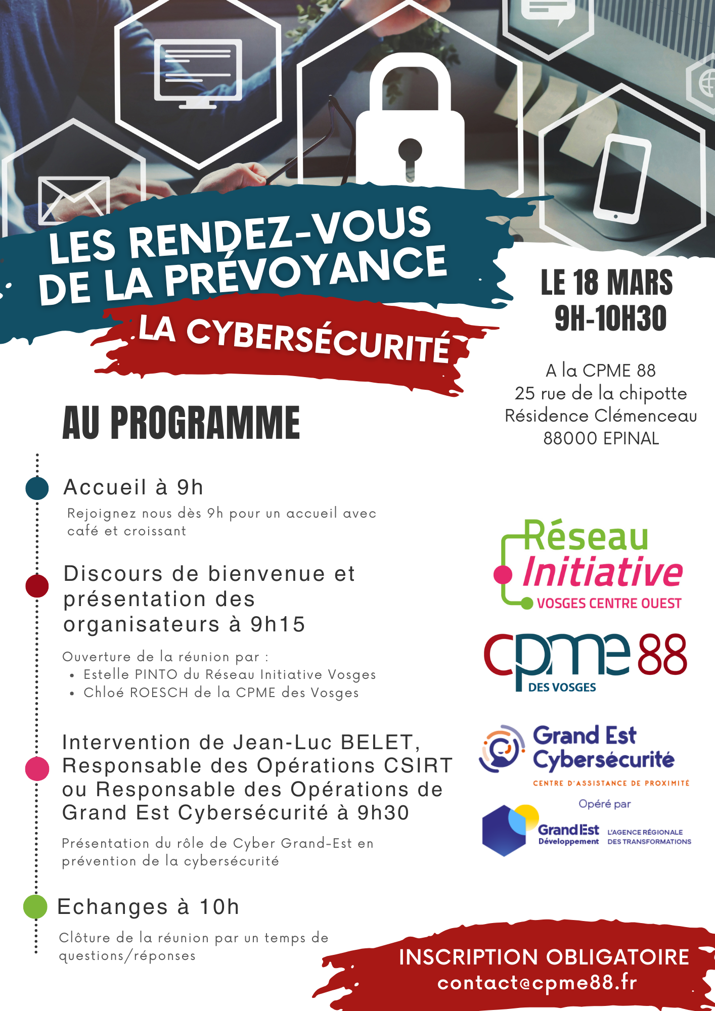 La CPME des Vosges s’associe au le Réseau Initiative Vosges afin de vous proposer une suite de réunions d’information sur la prévoyance du chef d’entreprise, au sens large : cybersécurité, santé mentale et physique, chômage, risques financiers…